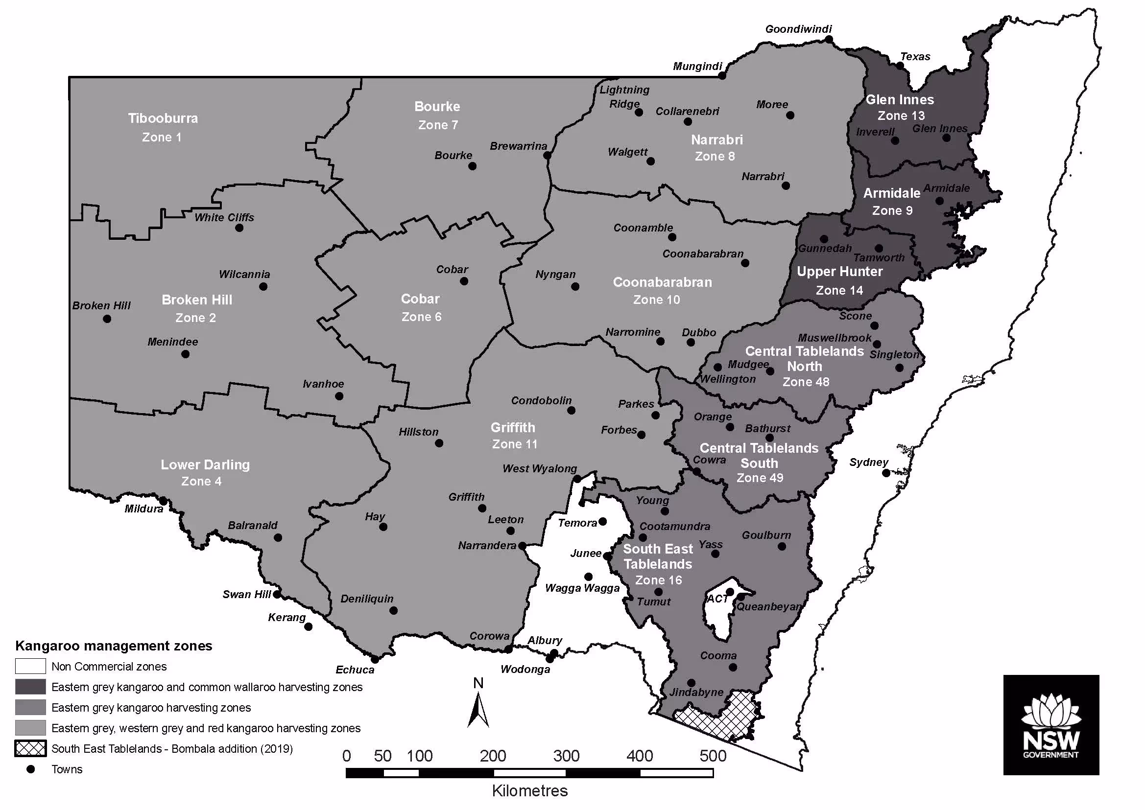 “The commercial Kangaroo ‘management’ area was expanded in 2020 to take in the former Wagga Wagga non-commercial zone to provide landholders with additional options to manage Kangaroo numbers. Expanding the Griffith Zone to include the new area increased it from 98,171 to 129,884 square kilometers. To achieve more refined management, this area was divided into the two new zones of Griffith North (65,758 square kilometers) and Griffith South (64,126 square kilometers)”. New South Wales Department of Planning, industry and Environment