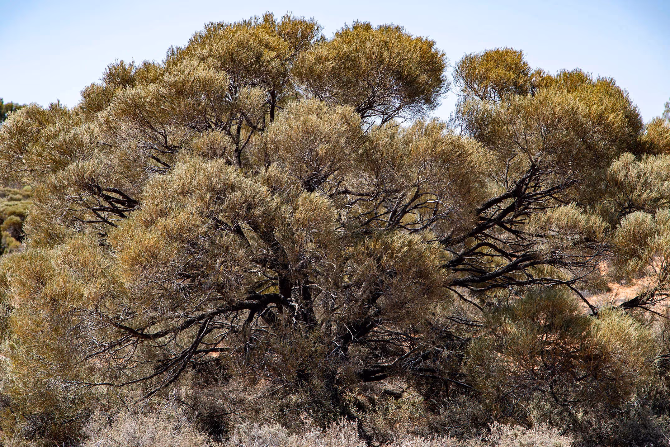 Plants we came across included: Butterfly Bush Petalostylisl abicheoides; Yacca Xanthorrhoea quadrangulata; Parrot Pea Crotalaria cunninghammi; Spring Pod Cassia Senna circinnata; Waddy Wood Acacia peuce; Book Leaf Mallee Eucalyptus kruseana; Porcupine Grass Triodia irritans; Woolly-calyxed Eremophila Eremophila lachnocalyx; Pearl Bluebush Maireana sedifolia; Flowering Lignum Eremophila polyclada; Bush Tomato; Desert Rose; Dense Cassia Senna artemisioides ssp. Sturtii; Needlebush Hakea leucoptera; Salt Gum Eucalyptus salicola; Native Pear Marsdenia Australis; Silver Mallee Eucalyptus crucis and Drooping Sheoak Allocasuarina verticillata.