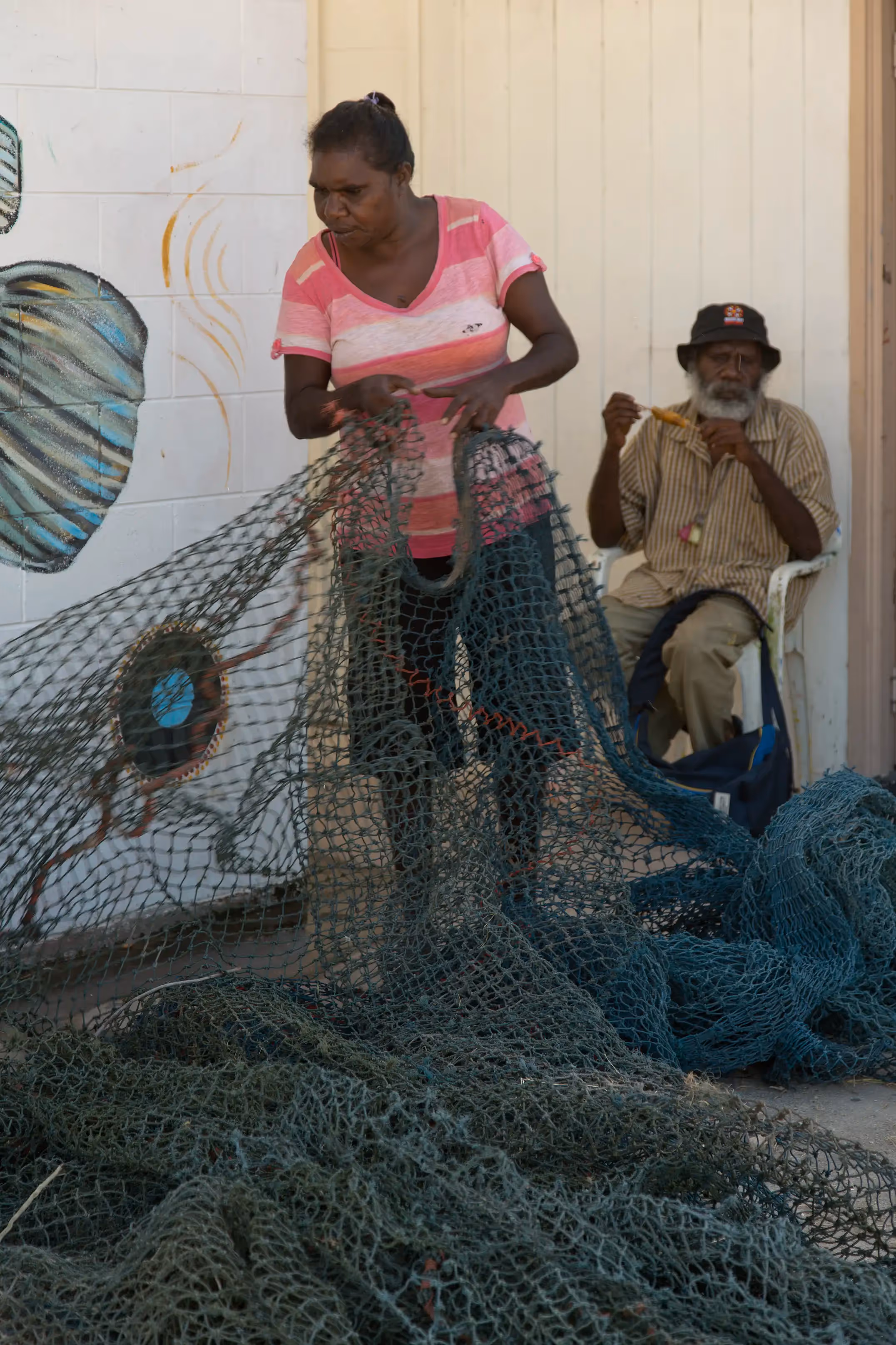 These northern Arnhem Land island communities like Langarra have strong artistic and creative cultures. The nearby and larger community of Galiwin'ku, with its population of around two thousand Yolŋu people, was the birthplace of internationally famous musician G Yunupingu. However beautiful his work was, today is not for music, we are on our way to meet the weavers of Langarra.