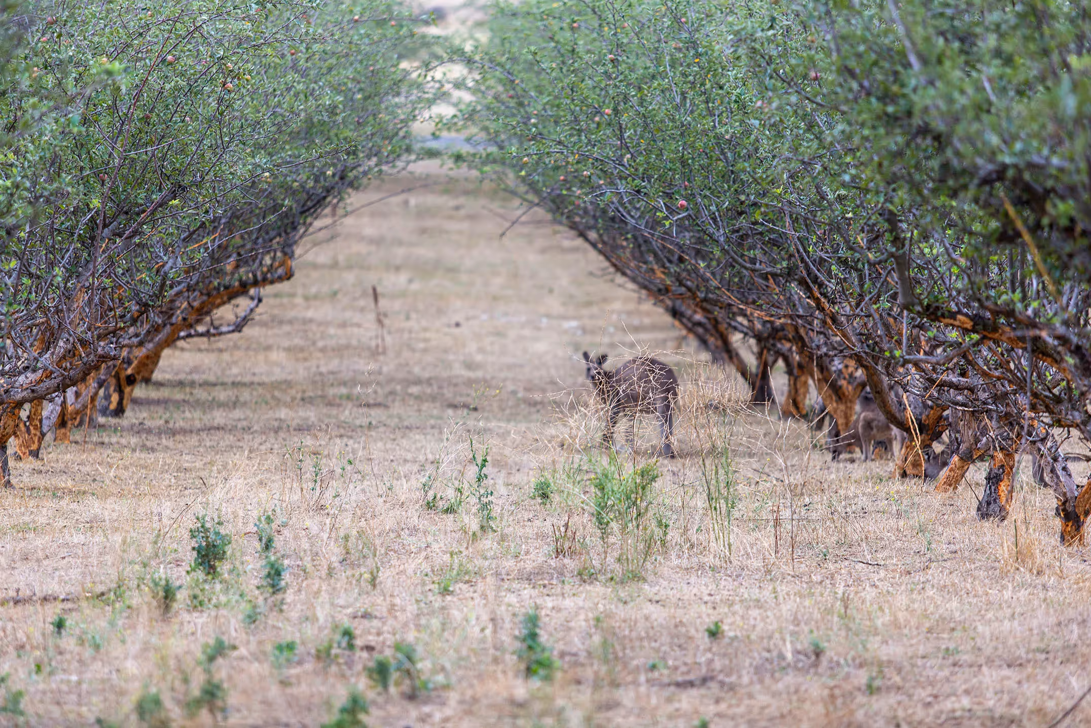 At the time of our visit, the Kangaroos (including joeys) had been gathered from the surrounding land and were held in the enclosed area. They joined the few Kangaroos already resident in the old orchard. During our visit we helped gather in the last few remaining Kangaroos from the mountain into the fenced collection area.