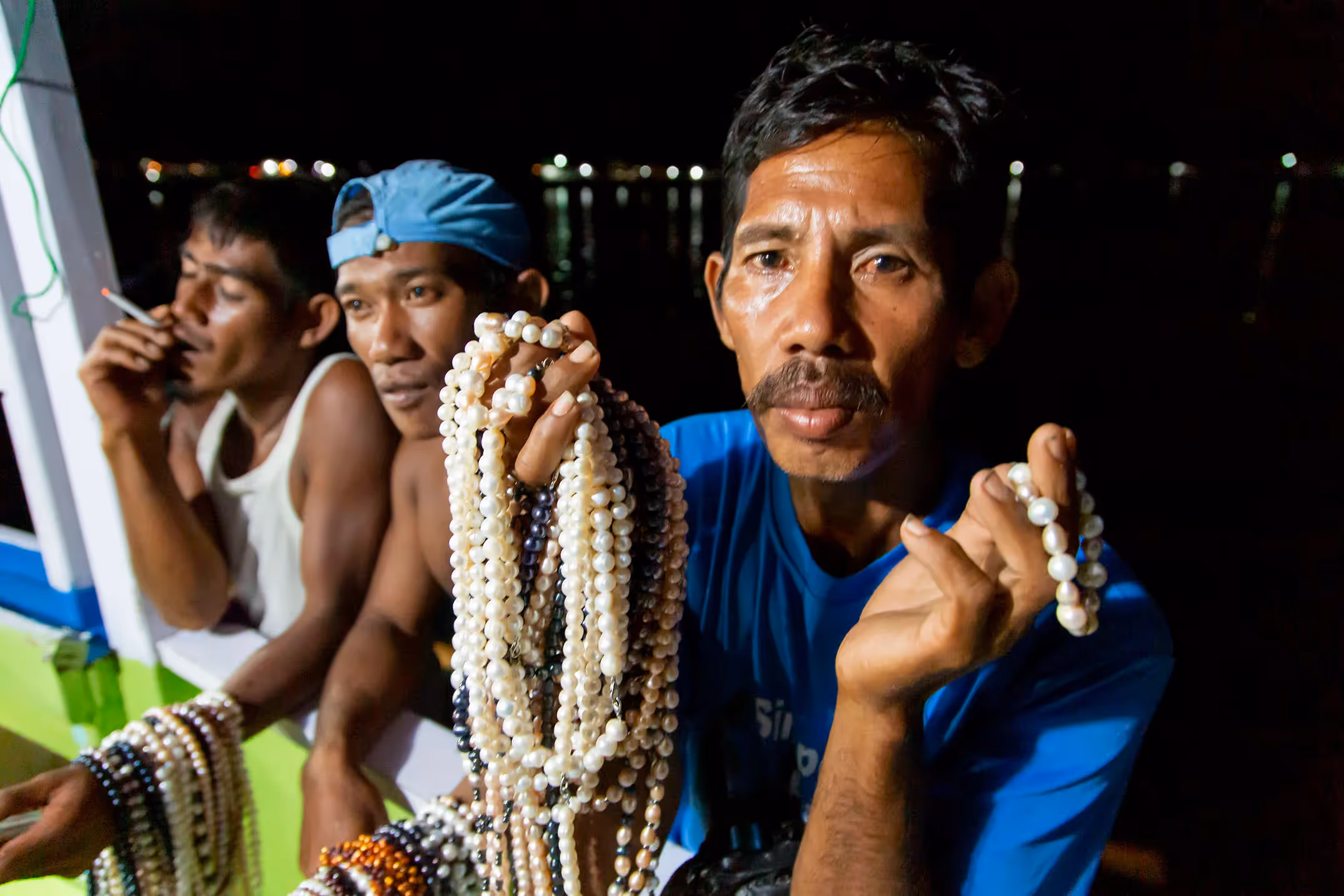 It is then we learn that it is not the Komodo Dragons we need to be careful of but the super sales team Komodo. Our boat rocks and there, silently and suddenly, are three of the villagers standing on a canoe alongside clutching handfuls of pearl necklaces shining white in the darkness. It is hard to escape these things, not really needing pearl necklaces we decide to buy one from each man to give the village economy a small boost. Eventually we are left to finish our meal. The necklaces bound for England as presents. Goods to a very different world.