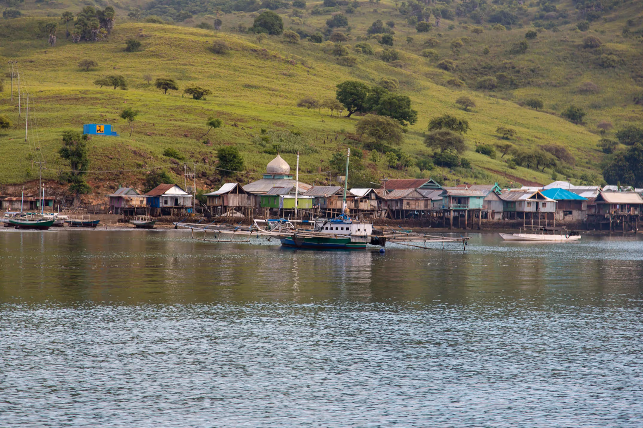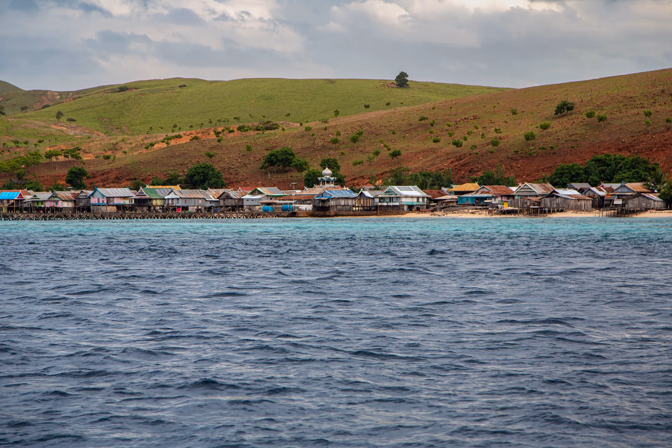 Komodo Village is typical of fishing villages in the region, the strip of houses hugging the shore, close together and jostling for space. Beautiful though. This is predominately a Muslim island of course, so centre stage is the Mosque. It is early morning prayers at around 4am that wake us up, the loudspeaker from the Mosque stutters, then silence, then the loudspeaker sparks to life again, the cockerels start to crow, adding their voice to the early morning sounds from the village. Nothing for it but to watch the dawn, we buy some fish from a local fisherman as he steers his boat home after a long night at sea.