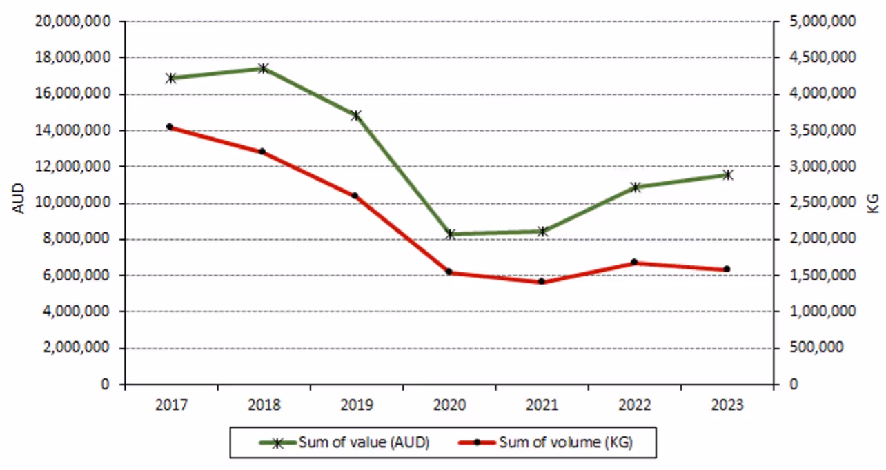 The graph shows the volume and value of Kangaroo meat exports - 2017 to 2023.