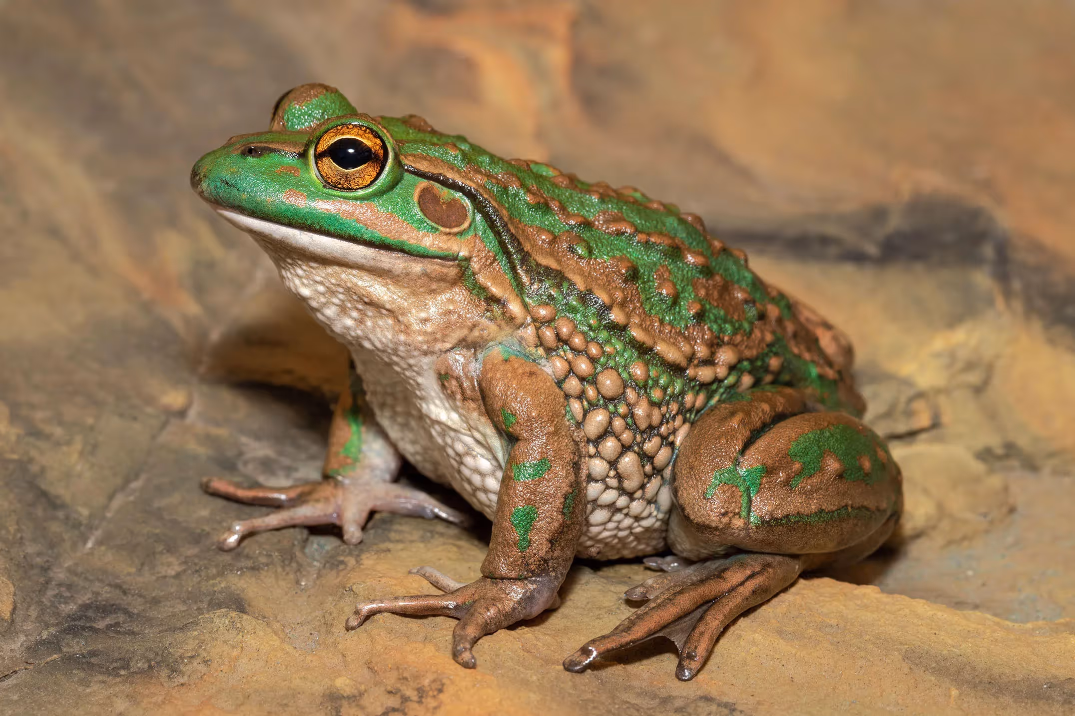 “The Growling Grass Frog is a large frog (females may exceed100 mm in length) that varies from dull olive to bright emerald-green on the back (dorsum), with large irregular blotches ranging from brown to rich golden-bronze”. Australian Government