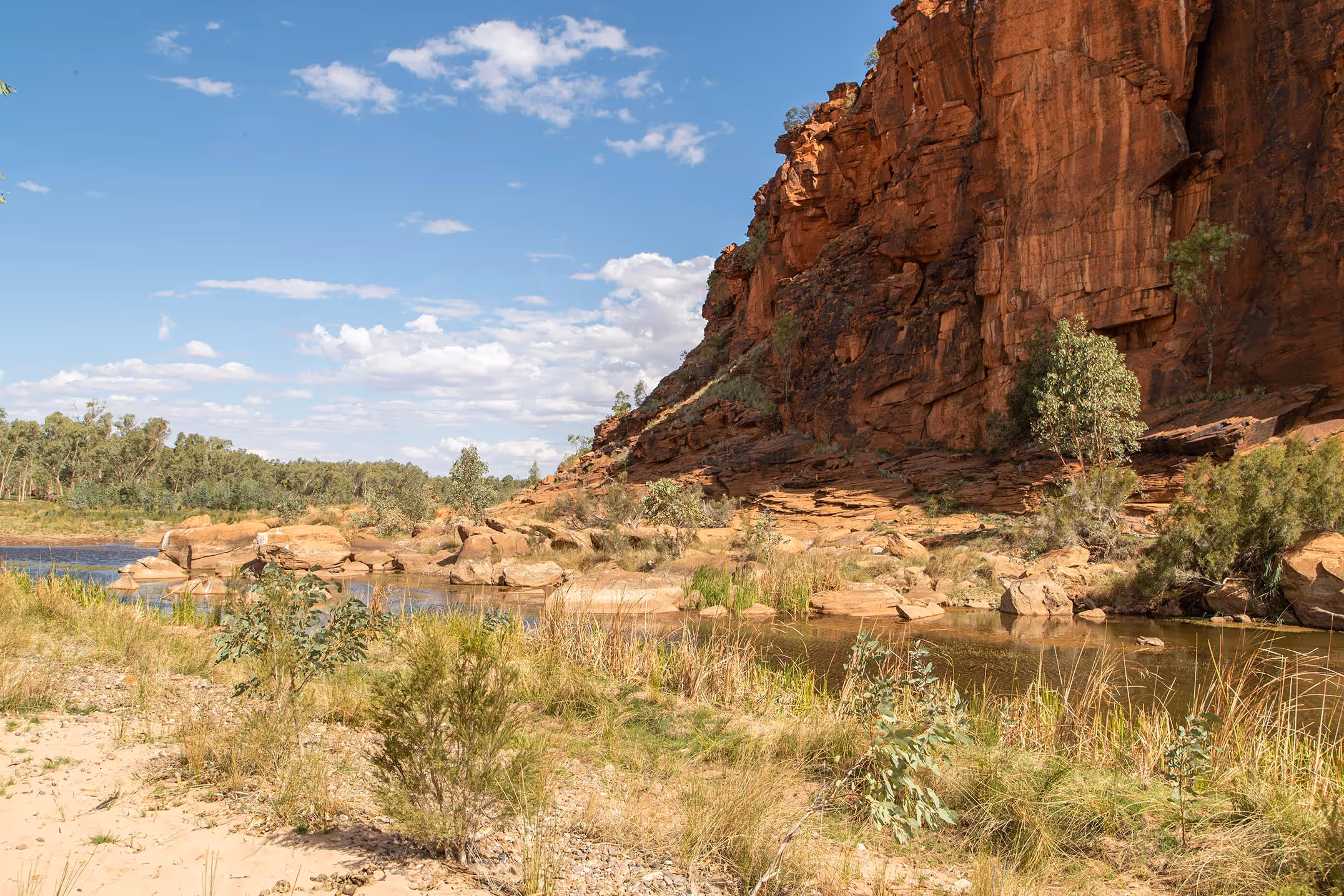 The dry riverbed with its occasional and very beautiful waterholes, its source in the MacDonnell Ranges, continues its journey to the Simpson Desert 600 kilometres to the south. The Finke is part of an interconnected system of rivers, when in flood its waters will eventually reach Lake Eyre.