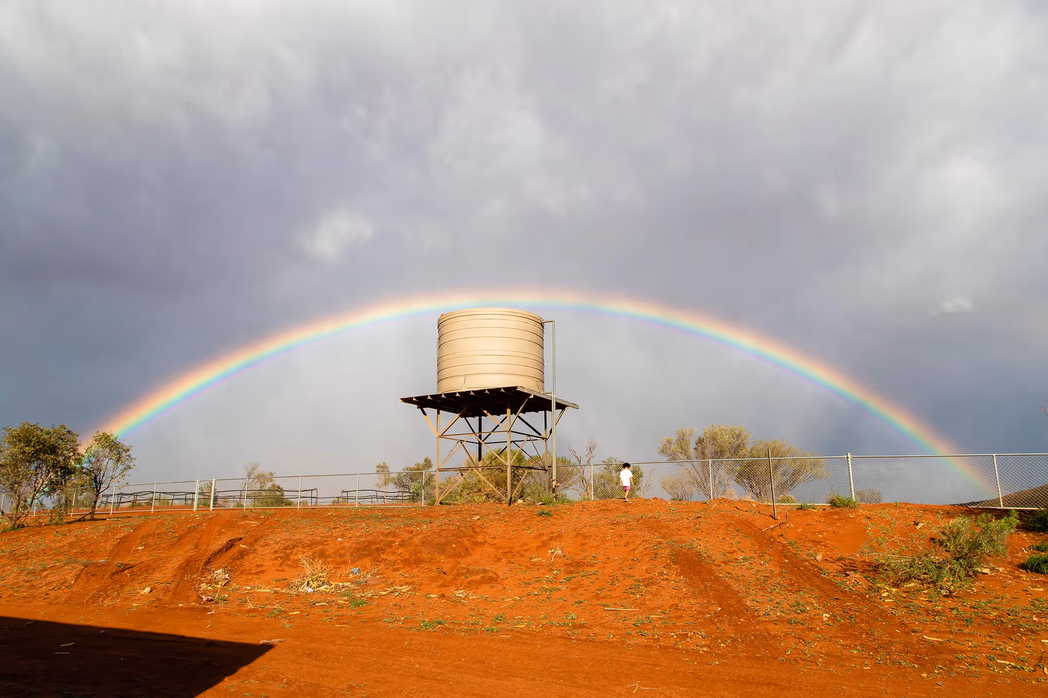 The double rainbow arches above us and is a sign of rain to come. Later that afternoon it begins to rain and Wallace Rockhole gets its small share. The red earth turning darker from the moistening rain. For a few minutes a fierce wind blows as pressure systems collide, Andrea runs for cover.